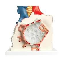 Легочная долька с прилегающими кровеносными сосудами : Модель демонстрирует внешнюю поверхность доли легкого с увеличением в 130 раз. На штативе модели наглядно представлено строение воздушных путей легких вплоть до альвеол.