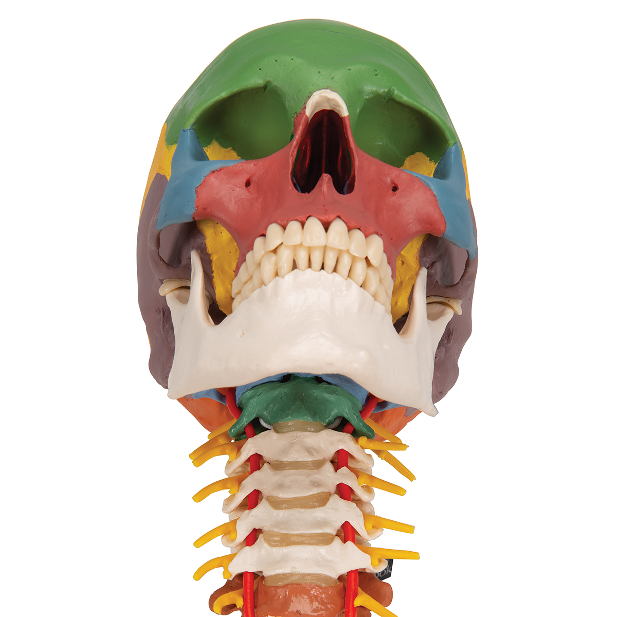 Изготовлена вручную из прочного небьющегося пластика с использованием 19 различных цветов, которые наглядно демонстрируют форму и взаиморасположение костных пластин черепа.