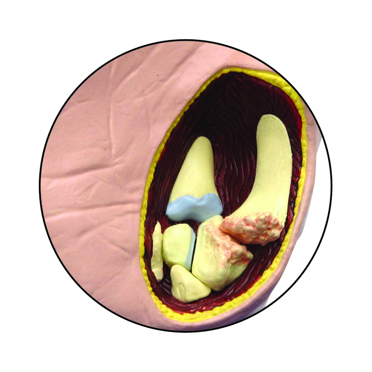 Модель кисти руки при остеоартрите представляет собой правую кисть в натуральную величину с разрезами, показывающими проявления остеоартрита: остеофиты (костные шпоры), узелки Гебердена и Бушара, деформацию большого пальца в виде шеи лебедя.