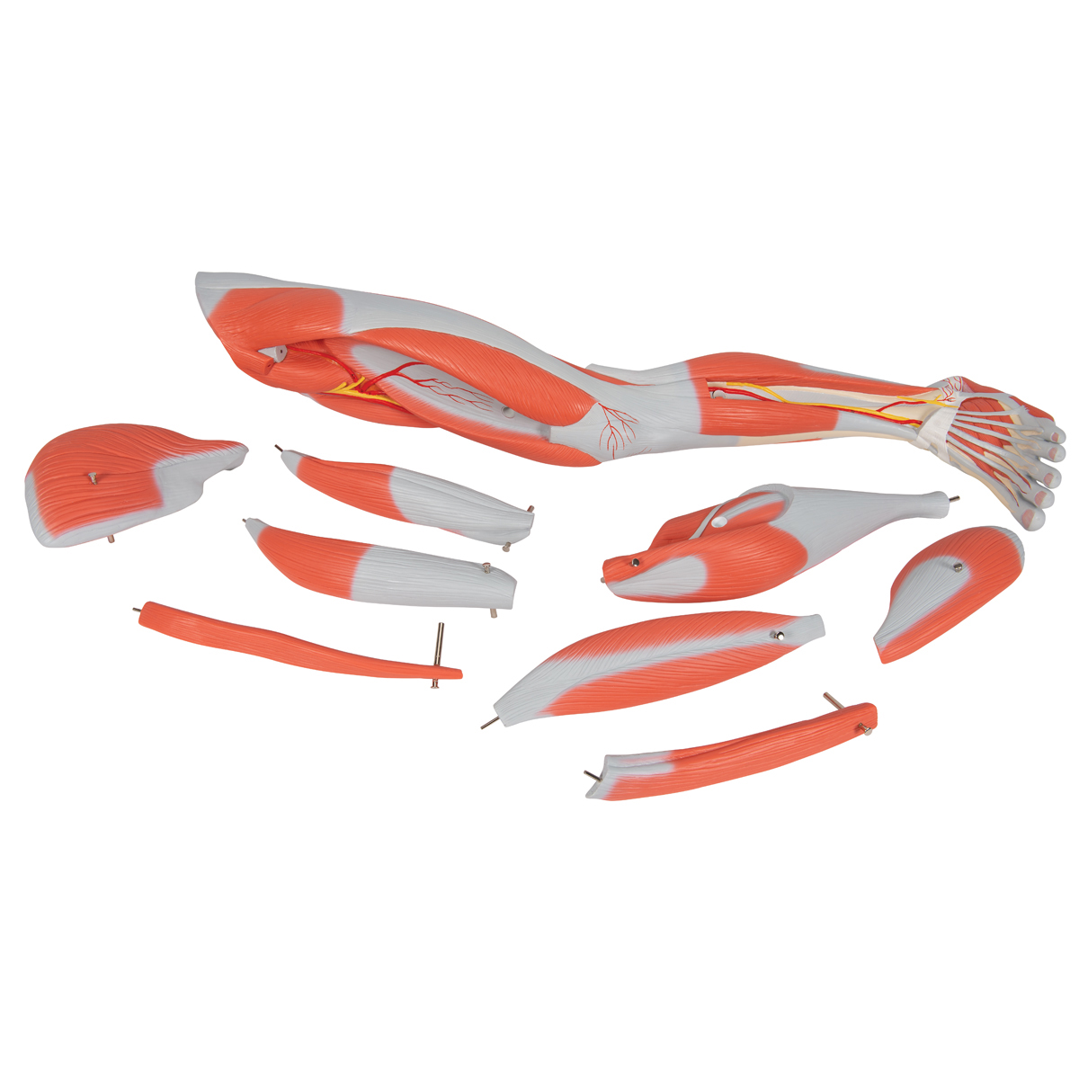 Модель ноги с мышцами, в 3/4 от натурального размера, показывает поверхностные и глубокие мышцы ноги стопы, 8 из которых съемные. Мышцы, сухожилия, сосуды, нервы и кости. На съемной подставке.