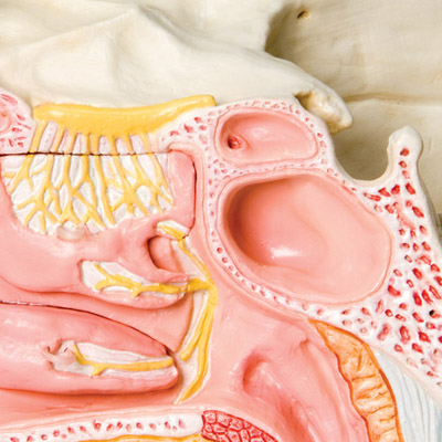 Модель показывает строение носа и околоносовых пазух, изображенных в правой верхней части лица, увеличение в 1,5 раза.
