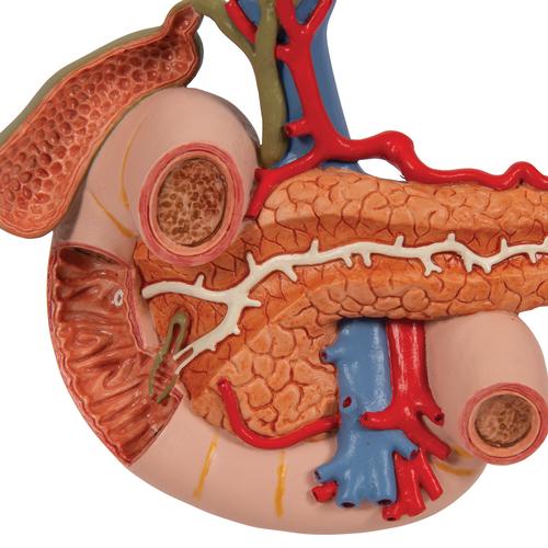 Модель в натуральную величину иллюстрирует 12-перстную кишку (некоторые части удалены), желчный пузырь и желчные протоки (на разрезе), поджелудочную железу (часть удалена так, что видны большие протоки), селезенку и окружающие сосуды. На подставке.