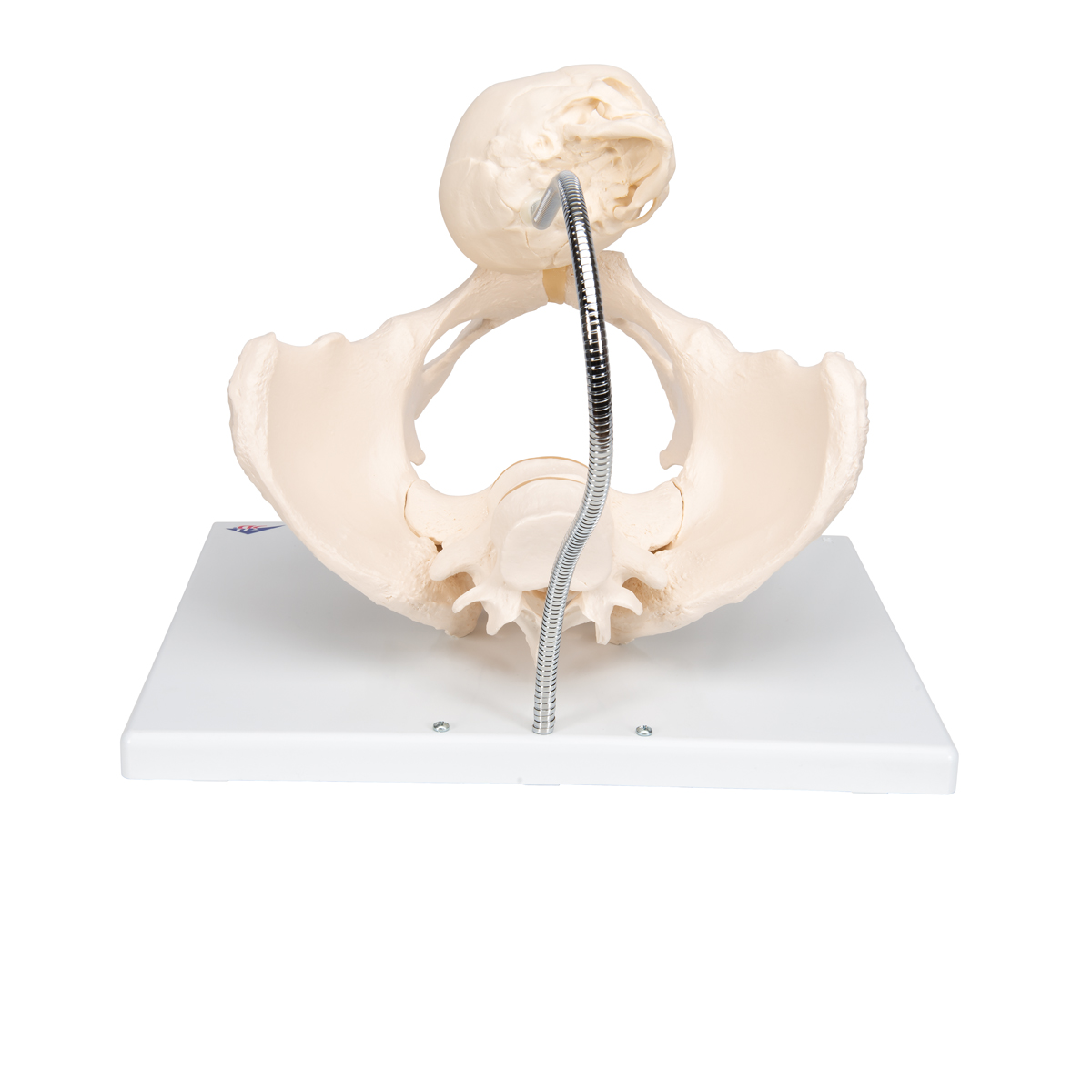 Эта модель наглядно показывает прохождение головки плода по женскому тазу во время родов. Скелет таза состоит из кости бедра, крестца и подвижного копчика, 2 поясничных позвонков и подвижного симфиза. Череп плода подвижно соединен с тазом. На подставке.
