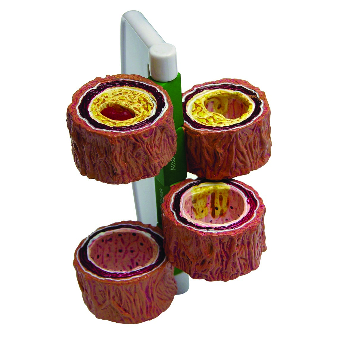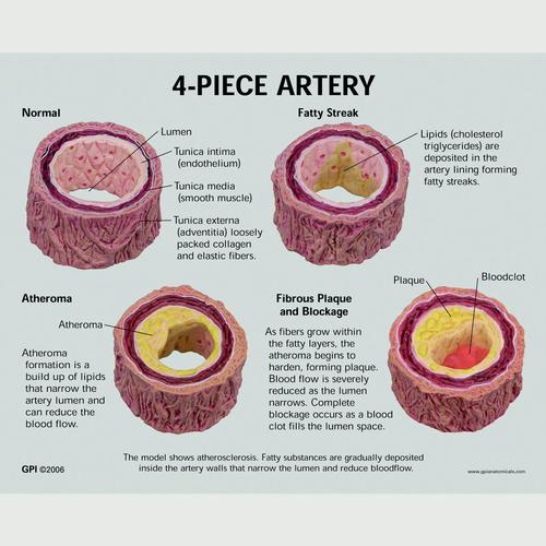 Четыре поперечные сечения артерии, показывающие атеросклероз, при котором имеет место сужение артерии, обусловленное скоплением жировой ткани (холестерина) и бляшек. Четыре стадии: нормальная артерия, полоска жира, фиброзная бляшка, закупорка. На данных стадиях происходит снижение кровотока, которое может приводить к образованию кровяных сгустков или тромбов. Все объекты поворачиваются на оси шарнира.